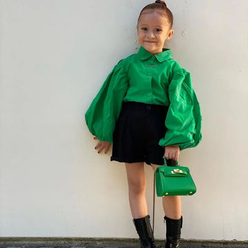 Baby Fashionista 2Pc Long Puff Sleeve Solid Green Blouse and Black Shorts Set