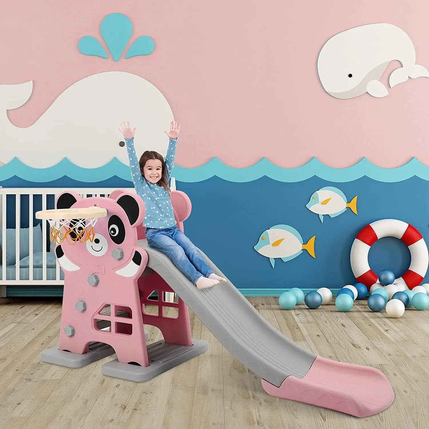FUN BASKETBALL HOOP: This Kids Slide includes a small size basketball. Your kids can make use of the basketball hoop to experience shooting, ball picking, running, jumping and other sports, which can enhance the kid's motor nerve and physical development abilities. And you can easily take it off when not using it.