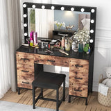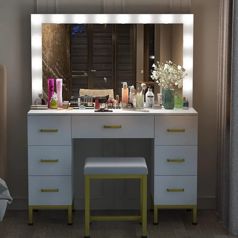 Teen Girls Large Makeup Vanity with 14PCS LED Bulbs, Cushioned Stool & 7 Drawers