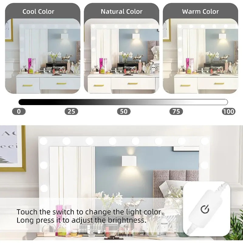 14PCS LED BULBS The vanity comes with 14 LED bulbs, provide you with soft light. These bulbs provide the perfect lighting environment for makeup, hair styling, making videos or taking pictures. |