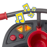 The trike features a removable activity tray with 6 interactive features to develop motor skills, a cup holder, an adjustable UV blocking canopy, and a 3-point safety harness.